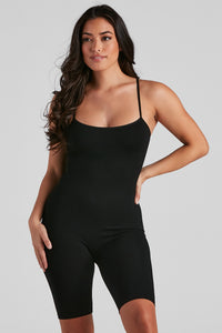 Stay comfy while running errands in this stylish seamless biker romper featuring a sleeveless, boat neckline, adjustable spaghetti straps, and a bodycon silhouette. Composed of stretchy rib-knit fabric. Finish the look in an oversized plaid shacket and a dad hat.