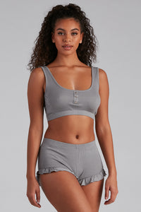 You're in for a perfect lounge sesh wearing this pajama set! The tank top features a sleeveless, scoop neck, front button accents, and an elasticized crop hem. The matching shorts feature a high-rise elastic waist with ruffled trim. Complete the look in cozy slippers.
