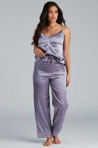 The finer things in life include this satin pajama set! Featuring a cami top with adjustable spaghetti straps, a v-neckline with trim, and a relaxed hem. The matching high-rise pants have an elastic drawstring waist and relaxed hem with trim. Complete the look in cozy slippers.