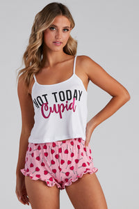 Avoid Cupid's arrow and look cute doing it. This pajama set features a sleeveless, scoop neck tank top with adjustable straps and a front graphic that reads, 'Not Today Cupid'. The high-rise shorts have an elastic waistband, heart graphics, and a flirty ruffled hem. Complete the look in furry slippers.