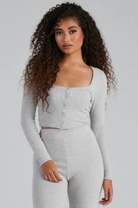 Get stylishly snug in this pajama top for lounging at home! It features long sleeves, a scoop neckline, and a button-down front on a cropped hem. The soft ribbed knit fabric offers a moderate stretch. Complete the look in the matching leggings.