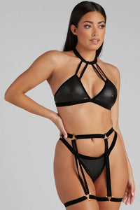 Showcase heart-stopping looks in this sultry lingerie set! It features an unpadded bra with triangle cups, a caged front, and a mock neckline. The set also features a matching high-cut panty with a thong design and sexy garter straps with gold metal accents. The bra and panty are composed of a smooth faux leather fabric with velvet strap detailing. Style this set with a flowy sheer duster.