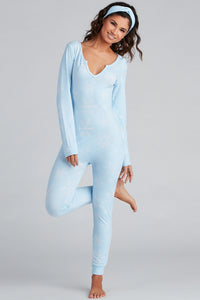 Let it snow! Cuddle up in a cozy onesie that features a snowflake pattern, a V-neckline with buttons, long sleeves, and fitted pants. The onesie is composed of a buttery soft brushed knit fabric that offers a form hugging fit with a moderate stretch. Complete your look with the included matching headband and slippers.