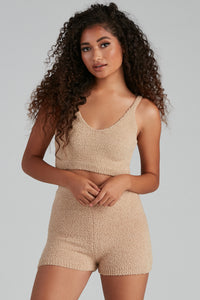 Cuddle up in this ultra-soft chenille knit pajama tank! It features a sleeveless V-neckline, thin shoulder straps, a cropped, form-hugging fit, and offers plenty of stretch for comfortable wear. Pair this tank with the matching pajama shorts and cozy slippers.
