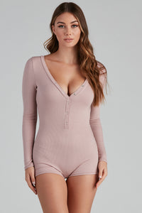 Get cozy for bed in this pajama romper featuring long sleeves, a v-neckline, and snap-button-down closures on a form-fitting short. Composed of a soft rib-knit fabric with a moderate stretch. Perfect for styling with fuzzy socks.