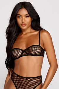 Keep your look sultry with this alluring bralette and panty set. It features a fishnet bralette with a structured design and adjustable spaghetti straps, as well as a matching high waist fishnet panty. Style this set with a sheer flowy duster.