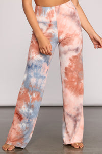 Get a casual and trendy loungewear look with these cute pajama pants! They feature a high-rise waist and a relaxed wide-leg fit. The cozy ribbed knit fabric has an all-over tie-dye print. Style these pants with the matching pajama bralette.