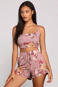Keep it dreamy in floral pajama shorts that are part cozy, part stylish! The pajama shorts feature an elastic high-rise waist, drawstring, hidden slant pockets, a gorge floral print, and a cheeky fit. Shorts are composed of a brushed knit fabric that offers a relaxed fit with a moderate stretch. Complete the look with the matching pajama tank.