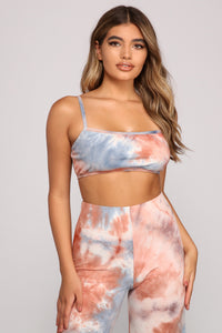 Get a casual and trendy loungewear look with this cute pajama bralette! It features a sleeveless square neckline, adjustable spaghetti straps, and a cropped fit. The cozy ribbed knit fabric has an all-over tie-dye print. Style this bralette with the matching pajama pants.