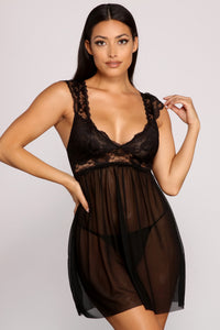 Bring the charm with a lace babydoll that allures! The babydoll features a sleeveless sweetheart neckline, a lace bodice, cap sleeves, a floral lace back with a small keyhole, and a sheer mini-length silhouette. The matching panty features a high-rise waist and thong bottom. Complete look with false lashes to create the perfect smoky eye!