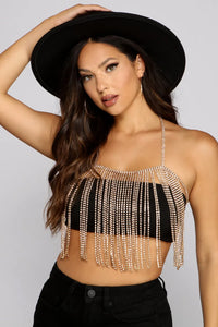 Bring the glow with a rhinestone bra that sparkles from every angle! Perfect to wear over your bikini tops or layered with a bandeau! The bra features a halter neck rhinestone chain, a sleeveless straight neckline, rhinestone fringe, and a dainty chain link back strap.