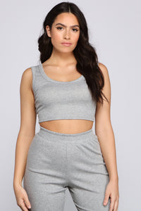 Chill out in a cozy cropped tank that is perfect for lounging. The pajama tank features a sleeveless scoop neckline, tank straps, and a cropped hem. The pajama tank is composed of a ribbed knit fabric that offers a relaxed fit with slight stretch. Complete look with the matching pajama leggings and slides.
