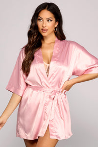 Wrap yourself with a stunning robe that adds that special touch to your outfits. The robe features a draped open front with an interior tie front, kimono sleeves, a tie-waist belt, and a mid-thigh length. The robe is composed of a satin-like fabric that offers a relaxed fit with minimal stretch. Complete look with a lace bra and panty set.