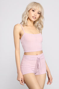 Keep it cute and cozy with pajama shorts that are oh so comfy to lounge in. The shorts feature an elastic high rise waist, a drawstring, and a cheeky fit, The shorts are composed of a brushed knit fabric that offers a relaxed fit with a moderate stretch. Complete look with the matching tank and slides.