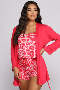 Keep it sweet and fierce in this cute pajama set! The set includes a tank and shorts combination that features a chic leopard print with pastel hues. The tank features a sleeveless scoop neckline, adjustable spaghetti straps, and a cropped hem. The matching shorts feature a mid-rise waist, a cheeky fit, and a ruffled hem. Complete your lounge outfit with fuzzy slippers.