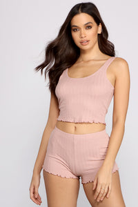 Keep it sweet and frilly in this cute pajama set! The set includes a tank and shorts combination that features a ribbed knit fabrication. The tank features a sleeveless scoop neckline, tank shoulder straps, and a cropped hem. The matching shorts feature a mid-rise waist, a cheeky fit, and a ruffled hem. Complete your lounge outfit with fuzzy slippers.