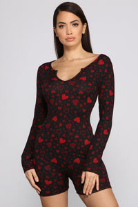 Capture hearts in this adorable pajama romper! It features long fitted sleeves, a notched V neckline, fitted shorts, and an all-over trendy heart pattern. Complete your perfect stay at home look with a pair of fuzzy slippers.