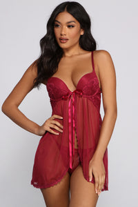 Let your body do all the talking when you slip into this sexy lingerie dress doll! The set features a lace chemise with lined lace cups, adjustable spaghetti straps, mesh lace design, and matching thong. Complete look with a sheer duster.