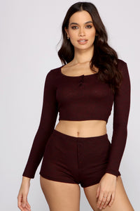 Lounge in coziness with a cute pajama top and shorts set! Perf for binging on your favorite shows, this set is a fab go-to! The set features a top with a scoop neckline, button-down front, long sleeves, and a cropped fit. The matching shorts feature a mid-rise fit, button detailing, and a cheeky fit. The set is composed of a soft to the touch chenille knit fabric that offers a relaxed fit. Complete look with fuzzy slippers!