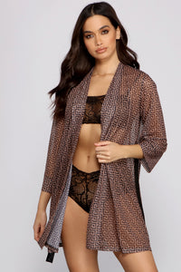 Stun like the goddess you are with this chic robe! The robe features a trendy Greek key print, a drape open front, a tie waist belt, and a mid-thigh length. The robe is composed of a sheer mesh fabric that offers a relaxed fit. Complete look with a sexy bra and panty set.