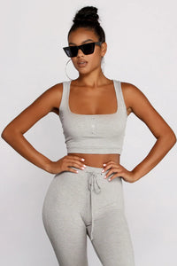 Keep it cozy in a basic pajama tank that is oh so soft to the touch. The tank features a sleeveless scoop neckline, tank straps, and a cropped hem. The pajama tank is composed of a ribbed knit fabric that offers a relaxed fit with a moderate stretch. Complete look with the matching pajama pants and fuzzy slides.