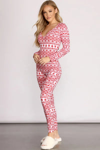 This cozy onesie is the one thing from your wish list that will totally get you into the holiday spirit! It features a notched front V neckline, long fitted sleeves, and form-fitting pant legs. Pair this cute and comfy onesie with fuzzy slippers.