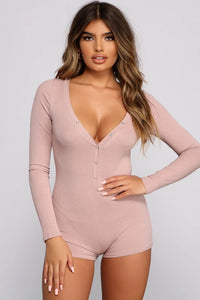 Keep it cute and chill in a pajama romper that is perfect for lounging in! The romper features a plunging V-neckline with multi-snap button closure, long sleeves, and fitted cheeky shorts. The romper is composed of a soft to the touch ribbed knit fabric that offers a moderate stretch. Complete your look with fuzzy slippers.