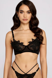 Bring the heat in this sultry lingerie set that captivates. The set features a sheer unlined mesh bralette with caged strap accents, adjustable spaghetti straps, supportive underwire, and a multi-hook and eye closure at the back. The matching panties feature a high rise fit and a cheeky fit.