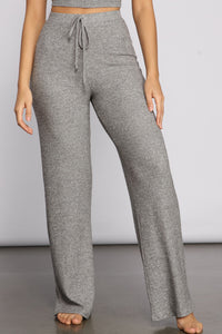 Keep it cozy in basic pajama pants that are oh so soft to the touch. The pants feature a high-rise drawstring, wide-leg hem, and composed of a ribbed knit fabric. Complete look with the matching pajama tank and fuzzy slides.