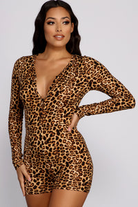 Get spotted in this cozy pajama romper that is chic and comfy enough to lounge in. The romper features a leopard print, a plunging V-neckline with button-down closure, long sleeves, and fitted cheeky shorts. Complete your look with fuzzy slippers.