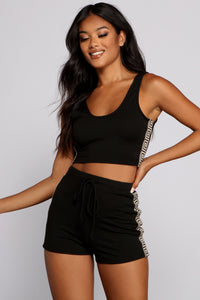 Take on trendy stripes in pajama shorts that are oh too cute! The shorts feature a mid-rise waist, narrow stripe pattern, and a lettuce edge hem. Complete look with the matching pajama top and fuzzy slides to create a cute casual loungwear outfit to binge your favorite shows in.