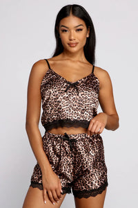 Keep it sleek in a pajama set that is oh so fierce. The set features a cropped sleeveless tank with a V-neckline, lace trim, and adjustable spaghetti straps. The matching shorts features a high rise waist, cheeky fit, and lace trim. Complete look with a pair of fuzzy slides.