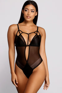 This sultry sheer mesh caged teddy will forever be yours! It features adjustable spaghetti straps for comfortable wear, a sexy caged front, and a sheer mesh design with a center cut out and open back. Pair with a flowy duster for the perfect stay at home look.