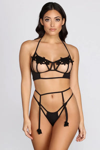 Have a night that you will never forget, and feel sexy af when you slip into this strappy bra+ panty set hot stuff!