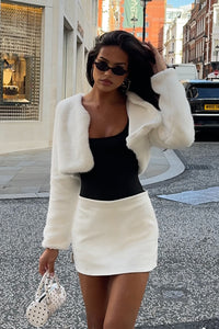 Become an icon layering on this faux fur cropped jacket this chilly season! Pair with a bodysuit and denim jeans.