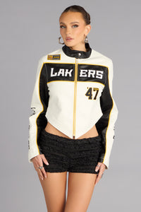 A moto jacket that walks in with confidence before you even say a word. The structured faux leather and bold Lakers detailing make it the standout layer your outfit has been waiting for.