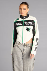 A moto jacket that walks in with confidence before you even say a word. The structured faux leather and bold Celtics detailing make it the standout layer your outfit has been waiting for.