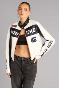 For the fan who likes her team spirit with a little attitude. This Knicks moto jacket blends sporty patches with a sleek, structured fit—perfect for turning a simple tee-and-jeans moment into a whole statement.