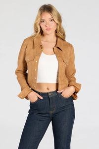 Layer this faux suede crop jacket for the perfect finishing touch as you head out the door!