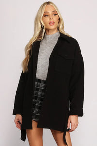 Layer up in a staple jacket that is perf enough to go with all your favorite casual outfits. The jacket features a collared neckline, long sleeves, a button-down front, two chest pockets with button closure, a removable tie waist belt, and a mid-thigh length. Complete look with a bodysuit and plaid skirt.