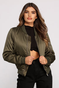Show em' all how you roll out with the squad! The jacket features a ribbed neckline, a zippered front, long sleeves with ribbed cuffs, and buttoned side pockets. The jacket is composed of a satin-like fabric that offers a form-hugging fit. Complete look with a bodysuit and black skinny jeans.