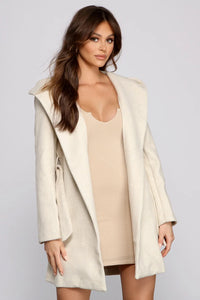 Layer on this fleece coat for heading into the city! It features a large hood, long sleeves, an open front, a tie-front belted waist, and a mid-length hem with a relaxed fit. Pair this coat over a cropped sweater with a high waist plaid skirt for a coffee date.