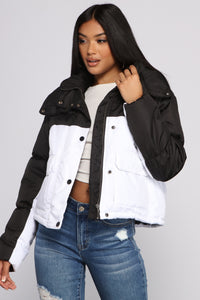 You're a stylish girl on the go, and you need a chic jacket to match your fashionable personality! This puffer features a black and white two-tone design, collared neckline, long sleeves, a complete zip front and snap button-down front, and an overall relaxed fit. Layer this nylon puffer over your fave pair of denim and style it up with combat booties.