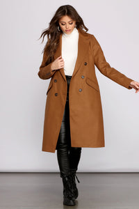 Hey, trendsetter! Stun in a long coat that brings sophistication to your outfits. The coat features a collared neckline, long sleeves with button detailing, a double-breast button closure, pleat detail, and a long length. Complete your look with a turtleneck sweater and faux leather leggings.