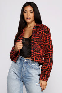 Hey fashionista! Impress with a jacket that is so on-trend! The jacket features a houndstooth print, a collared neckline, two faux buttoned chest pockets, a multi-button down closure, and a cropped hem. Complete your look with mom jeans, a bodysuit, and combat booties.