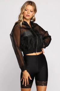 Get a city chic look in this trendy organza bomber jacket! Featuring a zip front and a sheer organza fabric, this jacket will help elevate any look. Pair with biker shorts and strappy heels for your next party and you'll be a total it-girl.
