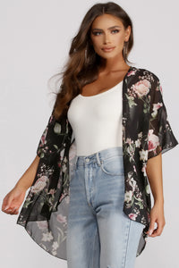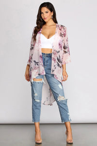 Bring a burst of florals in a kimono to layer with all your favorite looks. The kimono features a draped open front, an-all over floral print, long kimono sleeves, and a high low hem. Use this kimono as a coverup to layer over swimsuit or style with high waist shorts and a basic top.