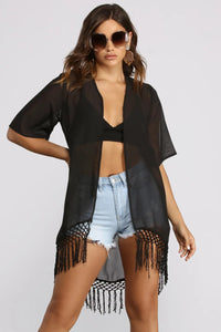 Keep it casual in a cute kimono. This layer-worthy piece features a draped open front, kimono sleeves, and a georgette tassel detail at the hem. Complete look with cut-off shorts and stylish sunglasses.