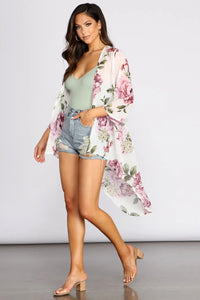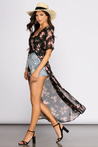 Get a fresh look, perf for the warmer months, with this gorg lightweight sheer floral duster! Pair with a simple tank and some distressed denim shorts!