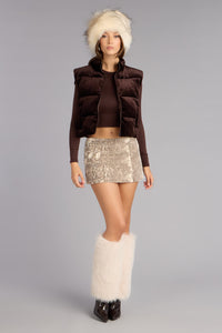Your off-duty look, elevated. This velvet puffer vest brings cozy luxe energy with a plush texture and cropped fit that instantly upgrades any casual ‘fit. Pair it with your favorite bottoms—it’s giving soft glam meets street luxe.